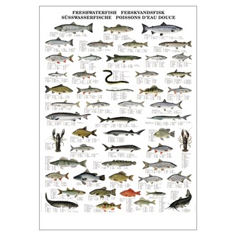 Visar 52 av de vanligaste sötvattenfiskarna från Europas sjöar och floder. Många av fiskarna är även vanliga i våra svenska vatten. Fiskarnas storlek finns angivna under varje bild. Affischen är flerspråkig med bl.a. de engelska fisknamnen.