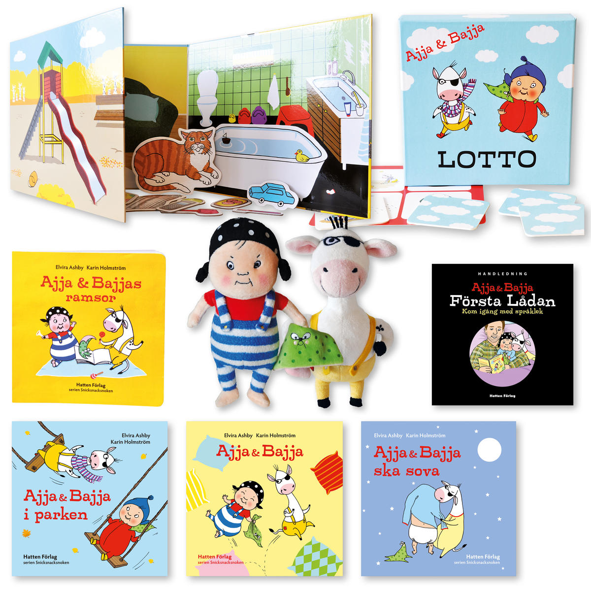 Lådan innehåller fyra böcker; ”Ajja & Bajja”, ”Ajja & Bajja i parken”, ”Ajja & Bajja ska sova” samt kartongboken ”Ajja&Bajjas ramsor”. Mjukisdockorna Ajja & Bajja, ett lottospel och en teaterkuliss med rekvisita ingår också. Handledning medföljer och hela materialet levereras i en praktisk plastlåda.