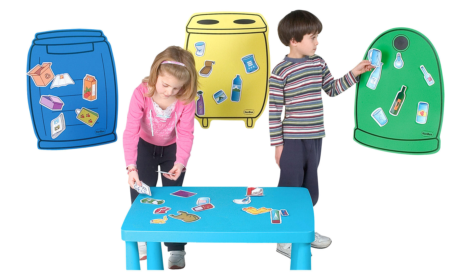 Öva sortering av papper, plast samt glas med hjälp av dessa tre stora behållare och 36 återvinningsbara föremål. Föremålen fäst med kardborre.