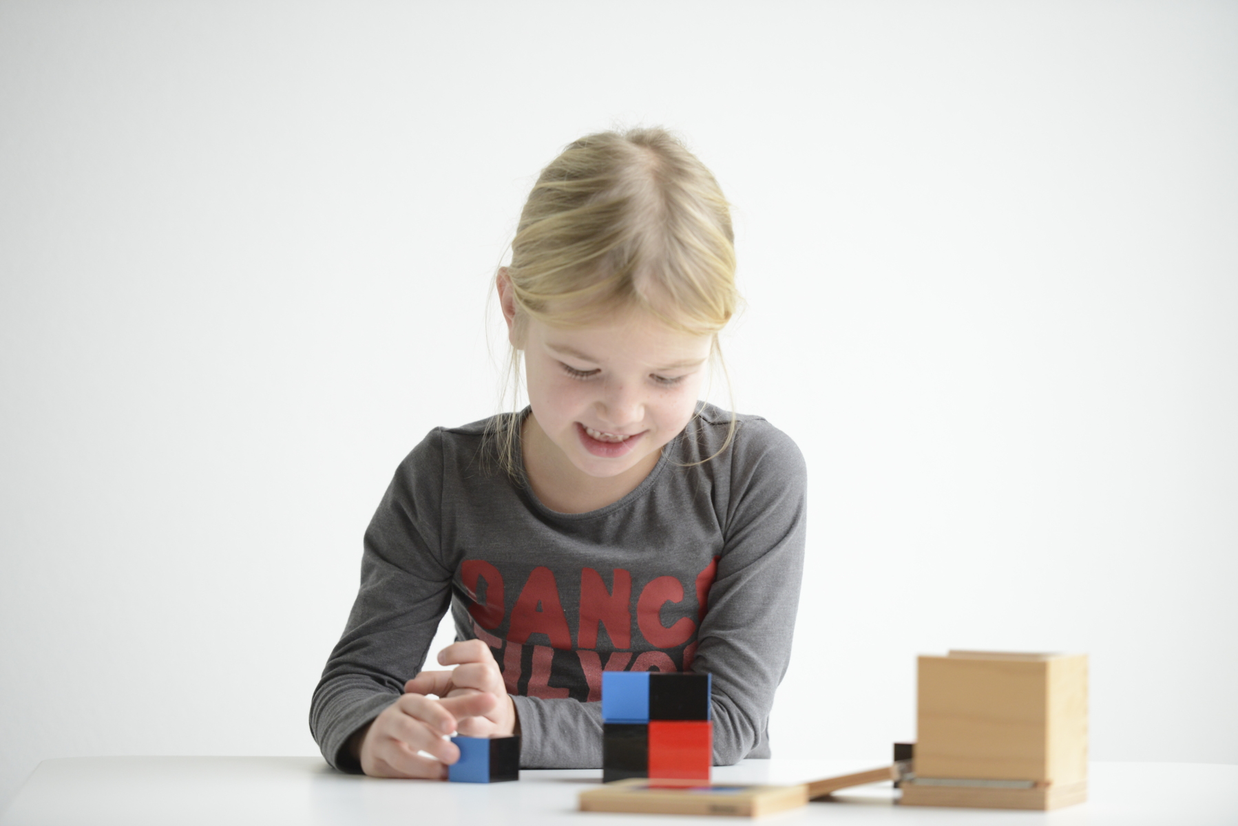 Binomiala kuben även kallad binomen. 8 träprismor/träkuber lackerade i rött, svart och blått. Övar förmågan att se skillnad i 3 olika dimensioner, tränar uppfattning av matematiska mönster och förbereder för arbete med algebra. Kan användas med yngre barn som ett pussel men ger också en konkret upplevelse av ekvationen (a+b)³. Kuben förvaras i en trälåda med lock där 2 sidor är nedfällbara. Från 4 år.