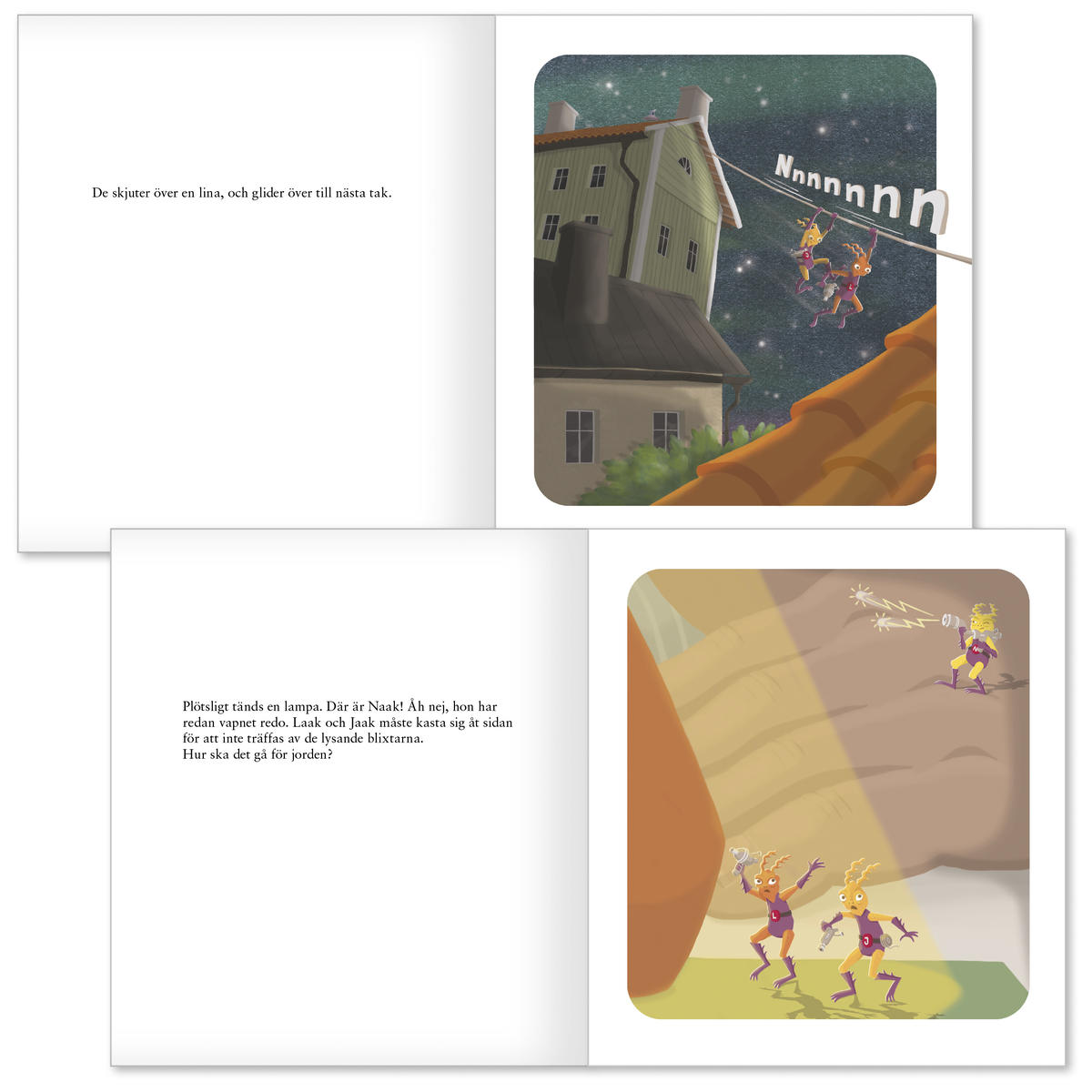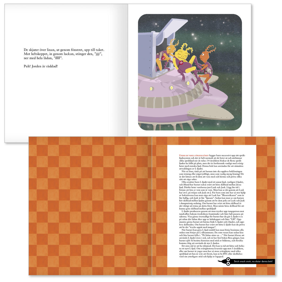 Rymdvarelserna Laak och Jaak landar på Lilla Luleågatan 11, utsända för att rädda jorden. Följ med på ett lustigt äventyr med lasersökare, linor och … en oväntad tvist! Som vanligt när det gäller Snicksnacksnokens böcker går även denna att använda för att på ett lätt och roligt sätt träna uttal, och nu är det L- och J-eller N-ljudet som är i fokus.