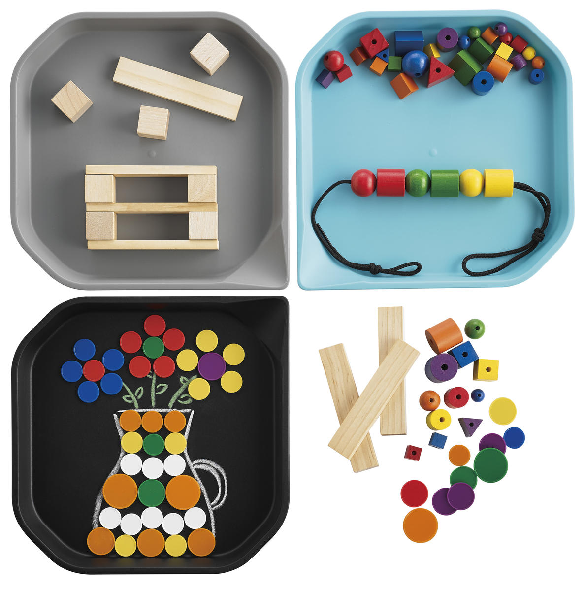 Brickor för sortering, lösa smådelar eller sensoriska övningar. Passar i aktivitetsbrickan 13664.