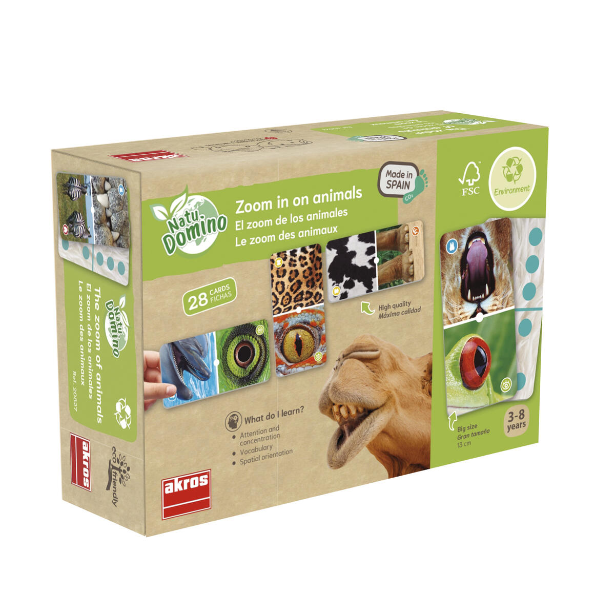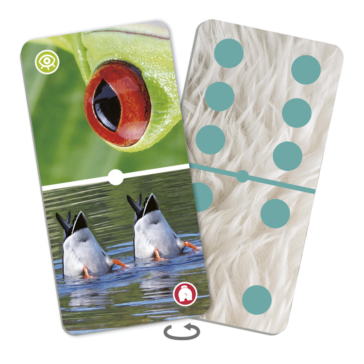 28 kort och 15 marker. Underbara bilder där man i dominot spelar med djur eller antal. Upptäck djurens olika delar (horn, fotspår, päls/fjädrar/fjäll, tänder, tassar/hovar/klor, ögon och rumpor/svansar). Ingående råvara FSC-märkt. PVC-fri. Från 3 år.