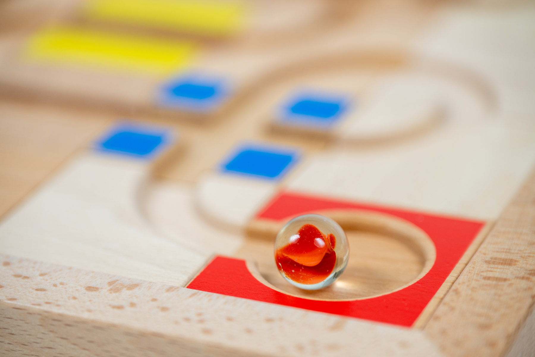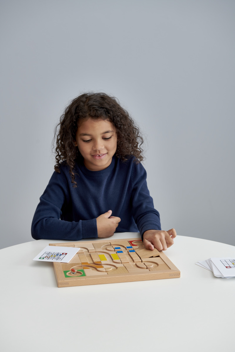 En stor hållbar träram och 40 träbrickor. 10 dubbelsidiga uppgiftskort i tålig plast, 2 kulor och en trälåda för förvaring. Material som tränar logiskt tänkande och problemlösningsförmåga. Kulan ska kunna ta sig från start till mål och barnen ska klura ut kulans väg och vilka brickor som behövs för att lösa uppgiften. Uppgiftskorten ger vägledning och facit. När kulans väg är utlagd blir det en samarbetsövning att få kulan att rulla från start till mål. Manual på engelska ingår. Mått träram: 31×31 cm, träbrickor: 5,5×5,5 cm, uppgiftskort: 13×10 cm, trälåda: 43,5×33,5×7,5 cm. Från 3 år.