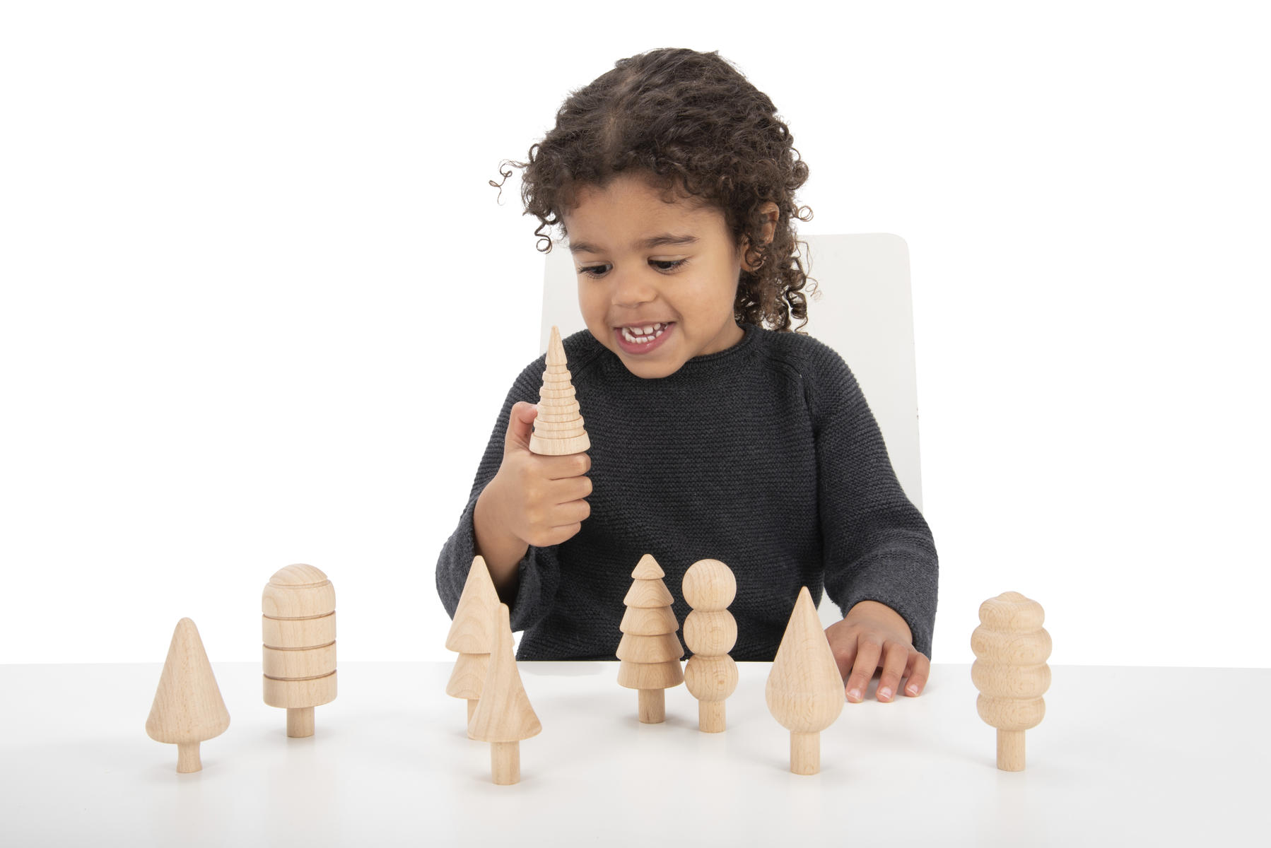 Träd i olika former och storlekar tillverkade av naturligt bokträ. Låt barnen l&a...