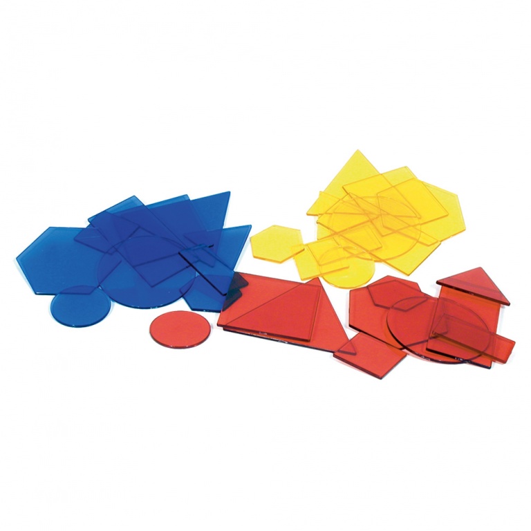 Fem olika geometriska former, stora och små, i tre olika färger.