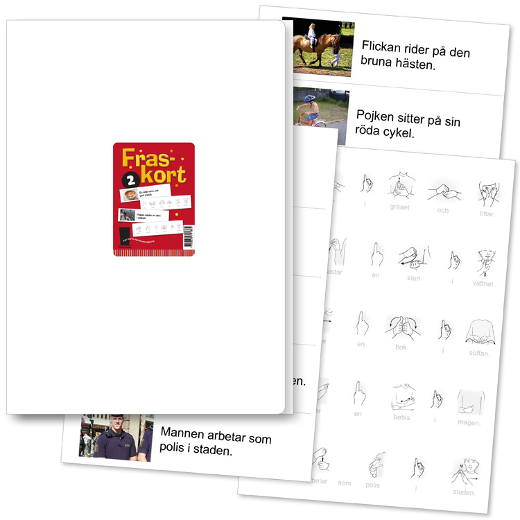 Enkla vardagsfraser med många användbara tecken. Fraskort 2 innehåller 50 stycken kort med 5-6-ords fraser. Ena sidan består av ett fotografi och text, på andra sidan finns teckenillustrationer och text.