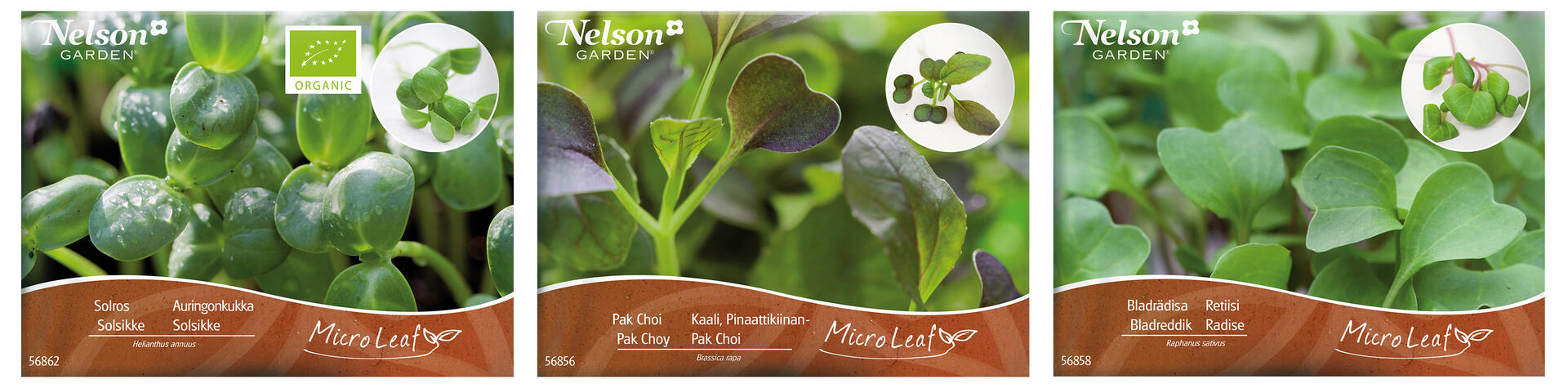 3 sorter/fp. Små, nyttiga och ätbara blad som odlas inomhus året runt – bara ett par veckor från sådd till skörd. Innehåller frön av bladrädisa, solros och pak choi. Anvisningar på fröpåsen.