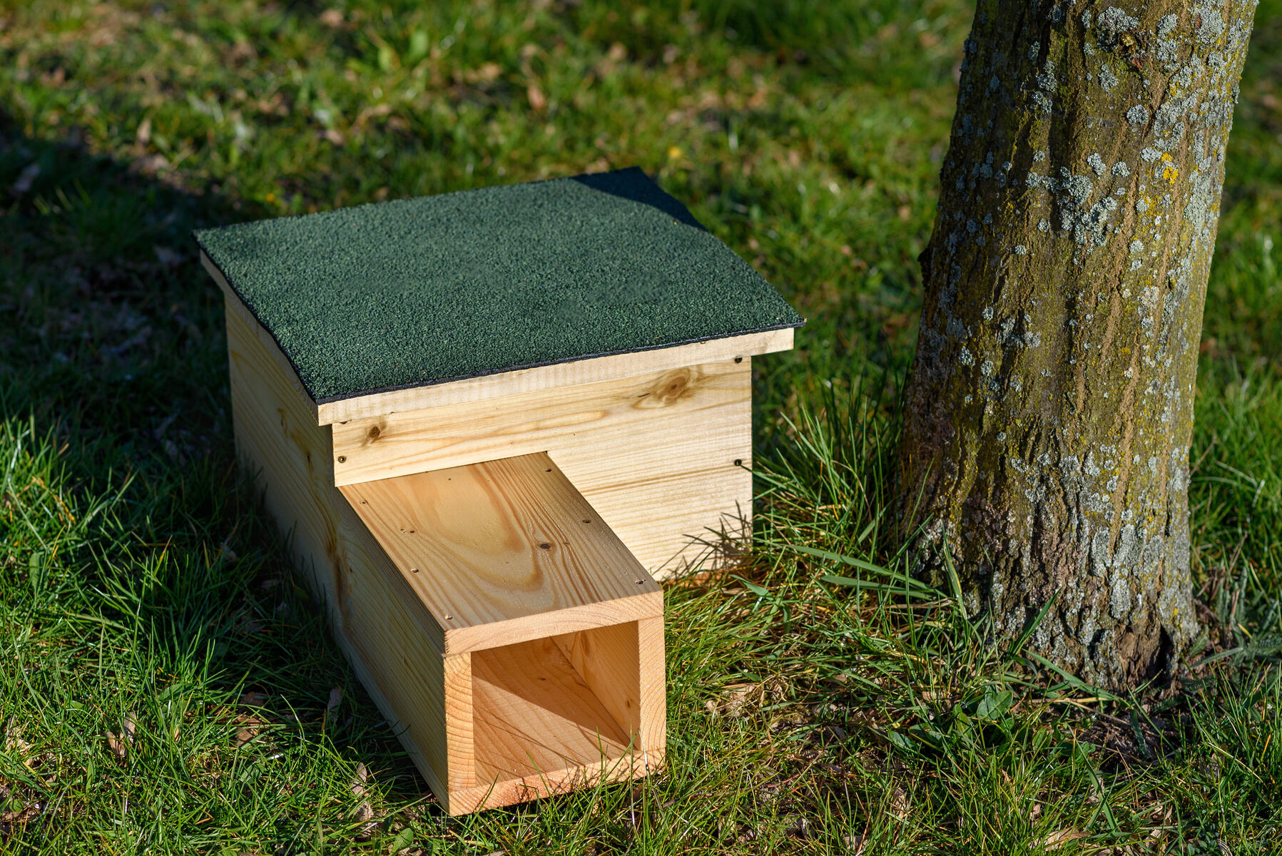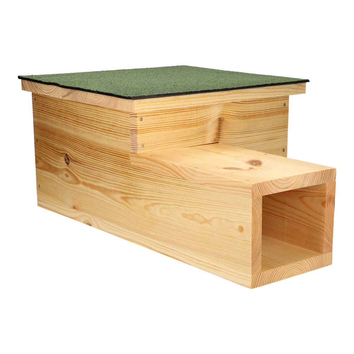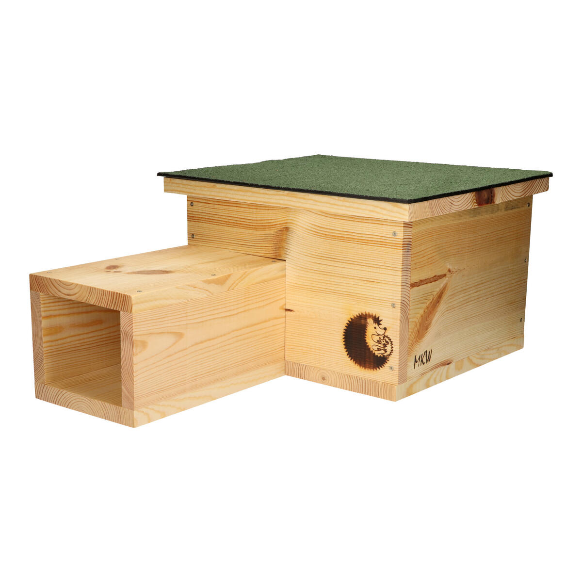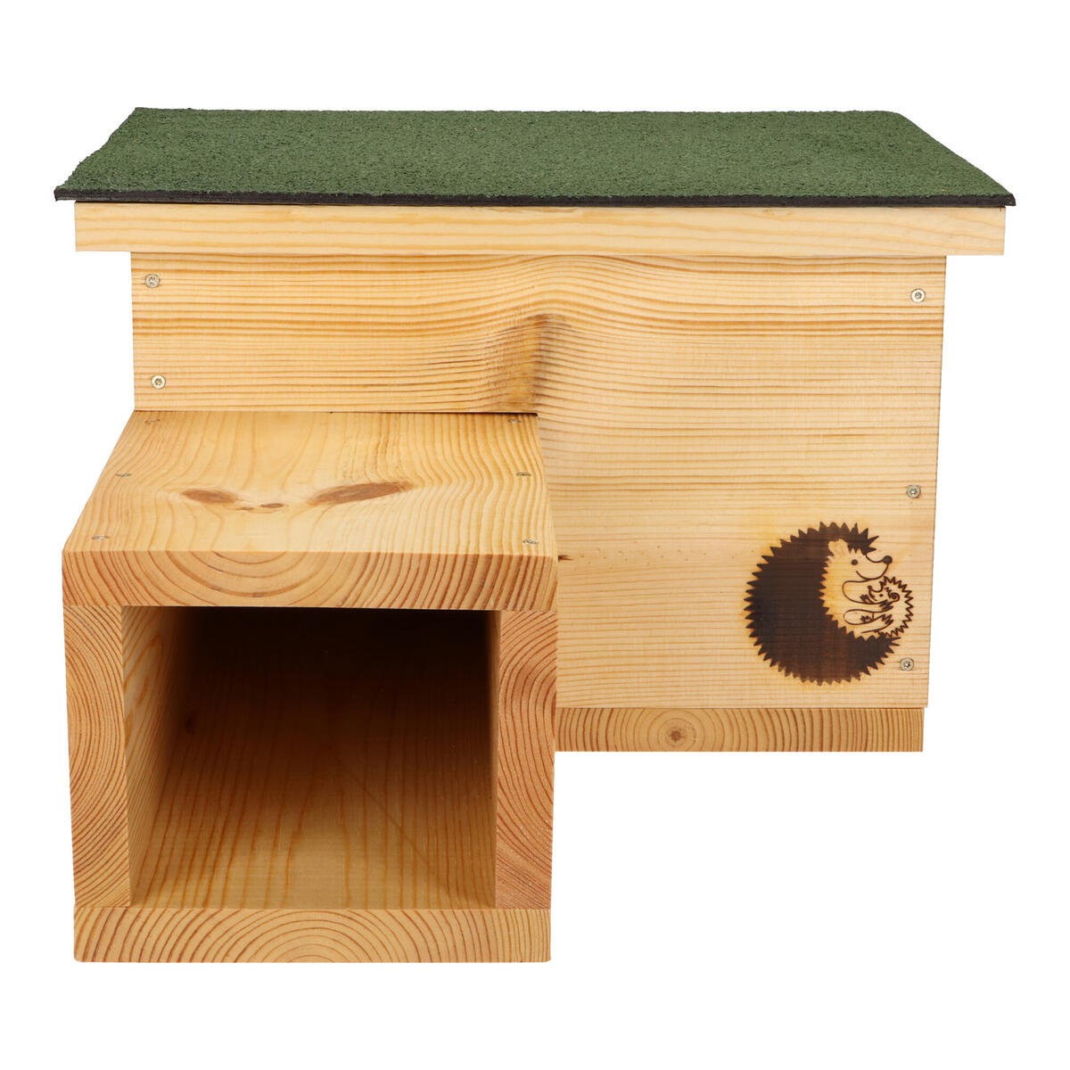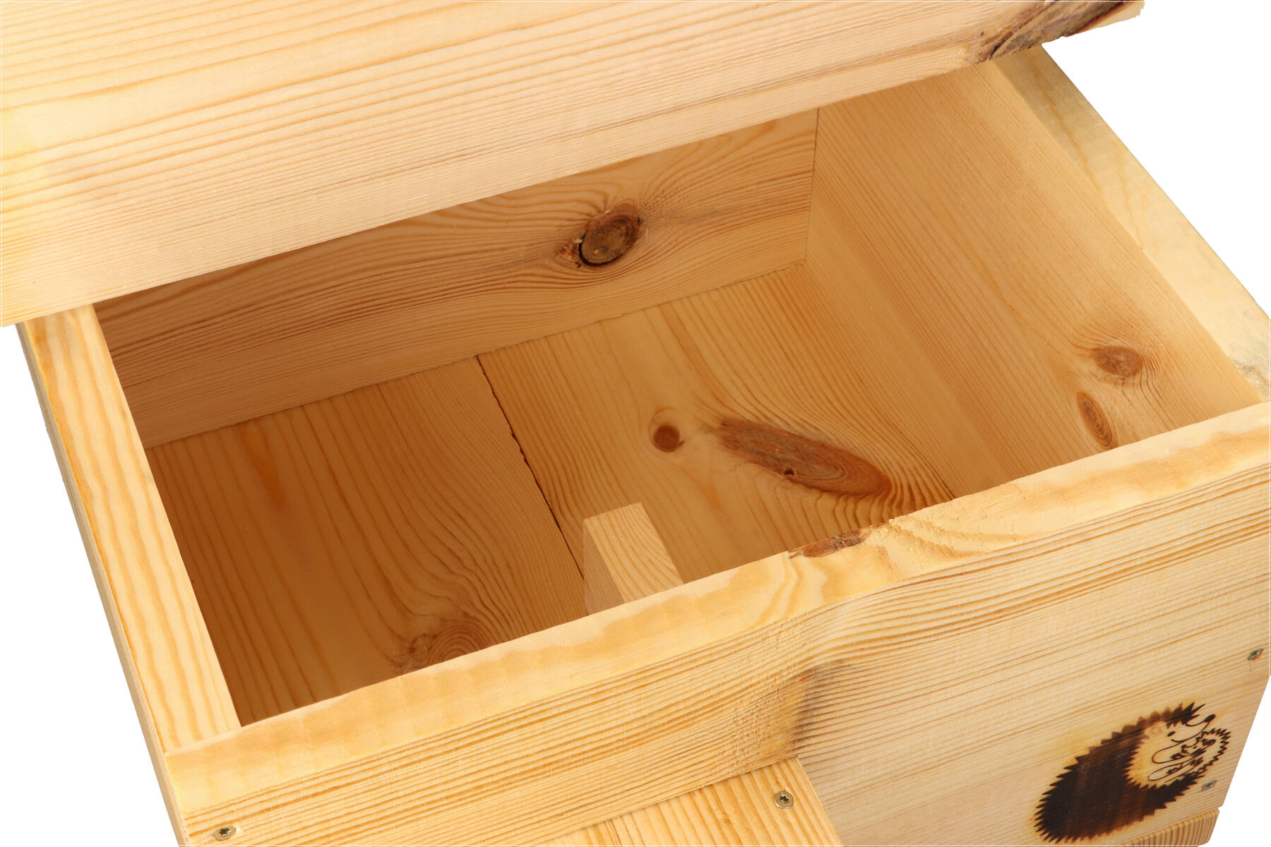 Detta igelkottshus håller hög kvalitet och är tillverkat av slitstarkt, massivt FSC-certifierat trä som är behandlat med 2 lager luktfri linolja. Huset har ett öppningsbart tak som är beklätt med skyddande tjärpapp. Ingången är en lång korridor som skyddar igelkottar mot rovdjur och ger optimala förhållande i huset. Trägolvet isolerar från den kalla, våta marken och huset har både dränering- och ventilationshål som gör det möjligt att upprätthålla ett lämpligt klimat inne i skyddet. Placera huset på en lugn, undangömd, om möjligt skuggad plats under buskar eller i en häck i trädgården. Levereras färdigmonterat med rostfria skruvar.