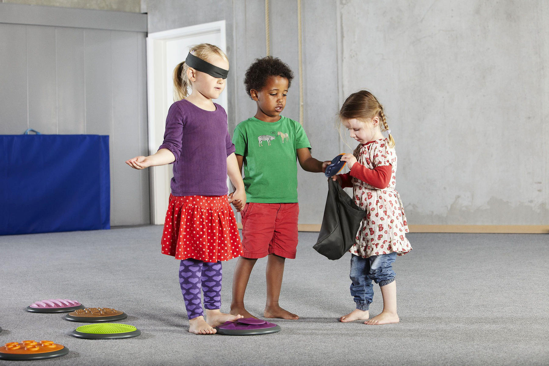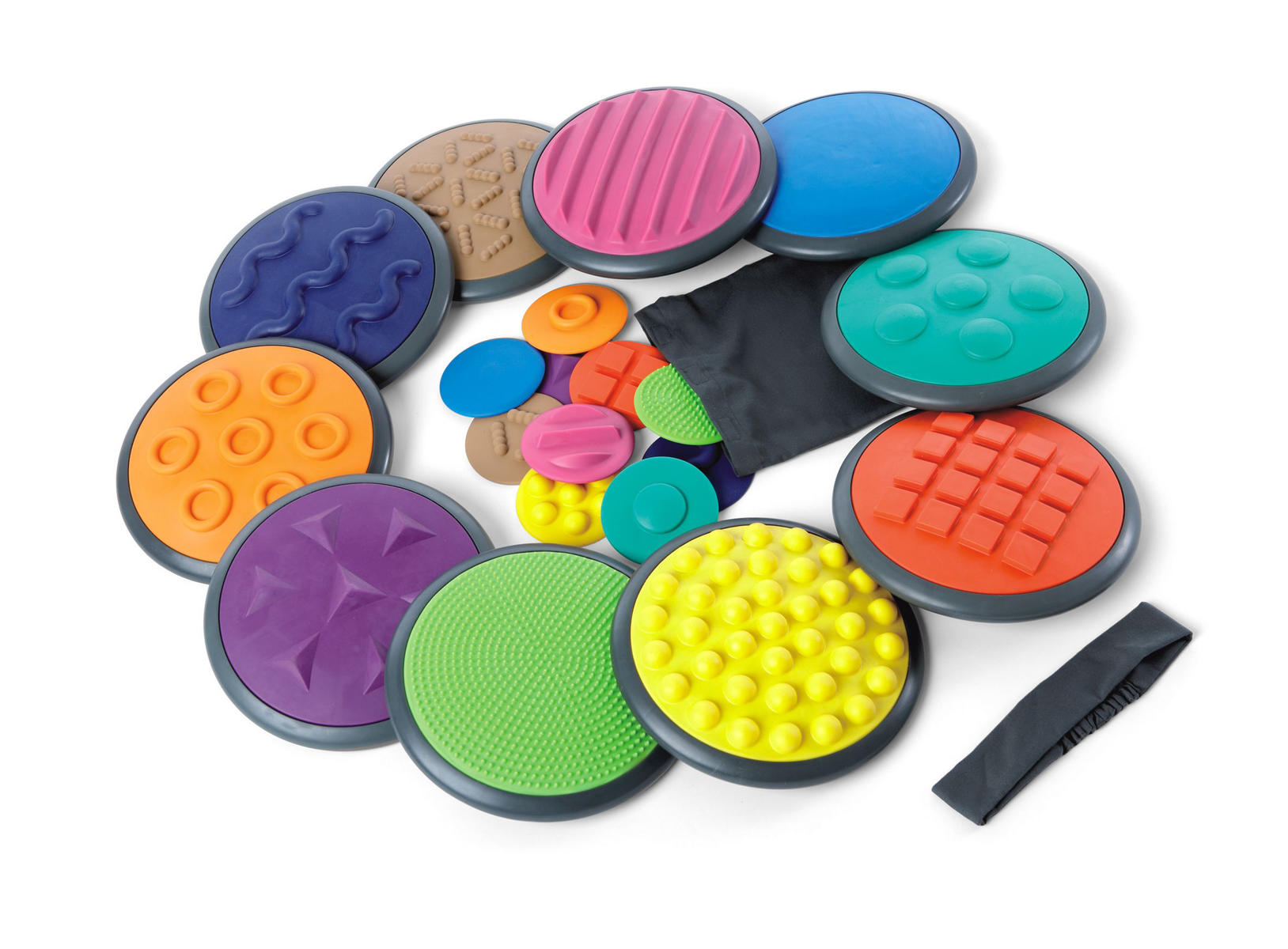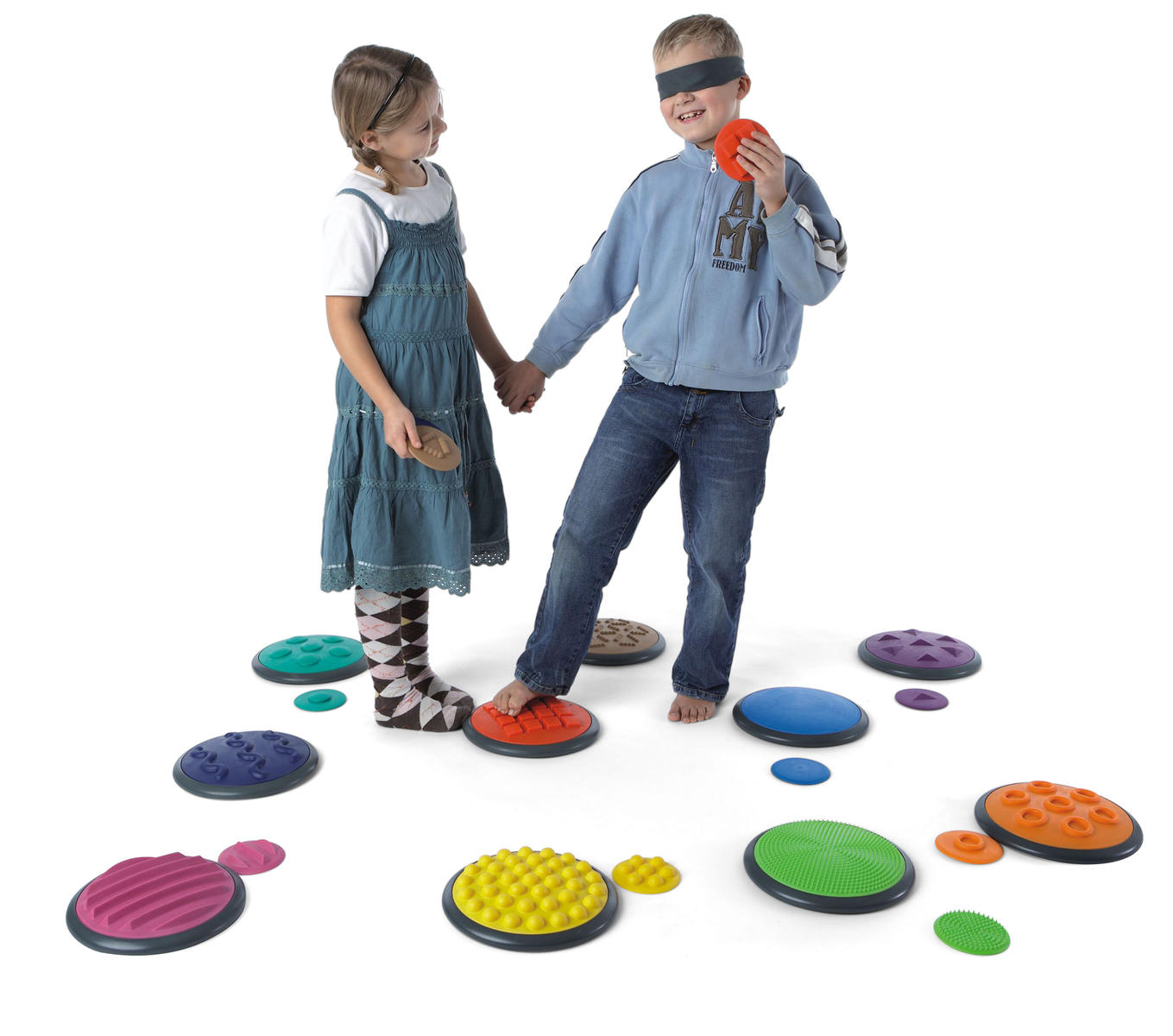 Lägg ut de stora taktila plattorna på golvet och sätt på ögonbindeln, plocka upp en liten platta ur påsen och känn efter med handen. Leta därefter upp motsvarande platta på golvet genom att känna med foten.