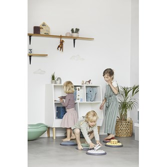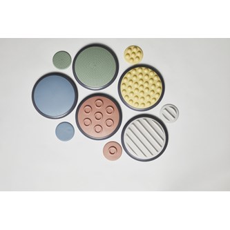 Känselspelet består av 5 stora gummiplattor med olika strukturer och färger att lägga ut på golvet. Tygpåsen innehåller 5 små plattor med samma struktur och färger som de stora samt en ögonbindel. Plattorna är av gummi och försedda med halkskydd. Mått: ø 27 cm och ø 11 cm. Exempel på övning: Lägg ut de stora taktila plattorna på golvet och sätt på ögonbindeln, plocka upp en liten platta ur påsen och känn efter med handen. Leta därefter upp motsvarande platta på golvet genom att känna med foten. Av ABS, TPE, bomull, velcro, stål.