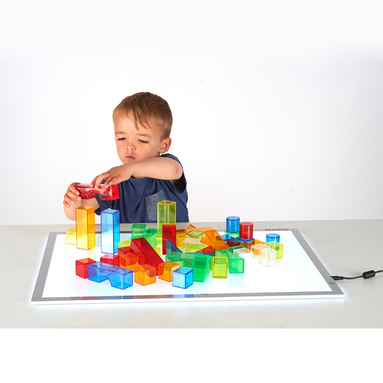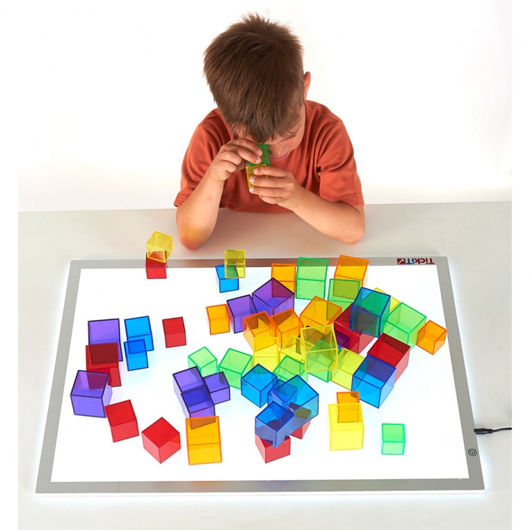 Klara plastkuber i 3 storlekar och 6 färger för att användas till olika ljusbordsaktiviteter som t ex sekvensövningar, sortering eller helt enkelt att bygga med.