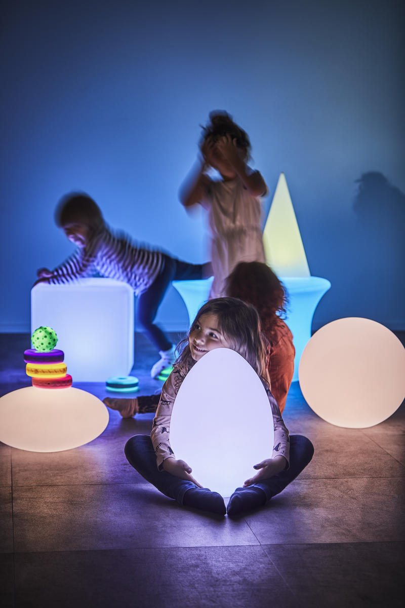 Skapa ett rum för att i stillhet utforska dina olika sinnen. Med den vackra pastellfärgade formen, som kan växla i 16 olika färger, blir atmosfären lugn och stämningsfull och lockar till vidare undersökningar och upplevelser. Med en fjärrkontroll kan färgen på ljuskällan regleras till en konstant färg eller till en långsamt varierande färgväxling.