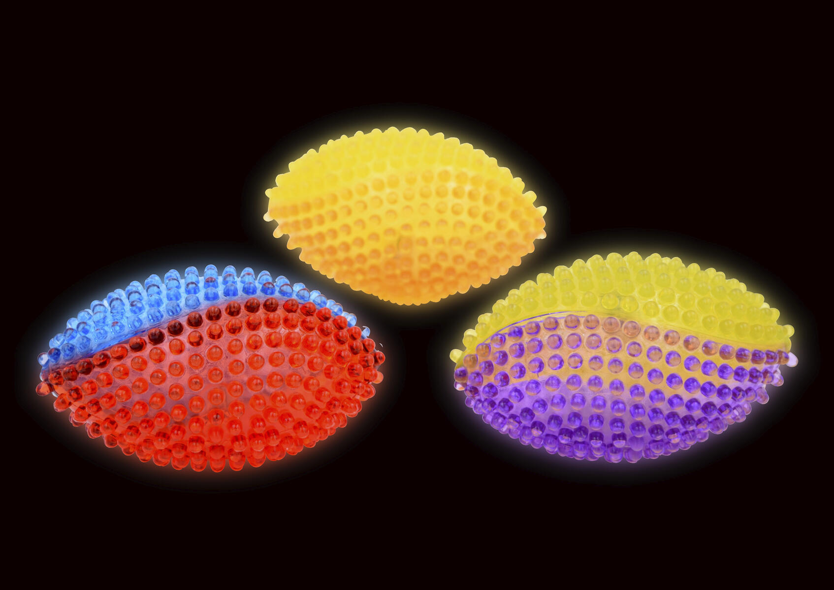En tvåfärgad rugbyformad boll som är lätt att hålla men den taktila ytan med mjuka knoppar gör att den studsar åt olika håll varje gång. Rolig, taktilt stimulerande och blinkande. Den blir extra rolig i ett mörkt rum. Mått: 12×8 cm.