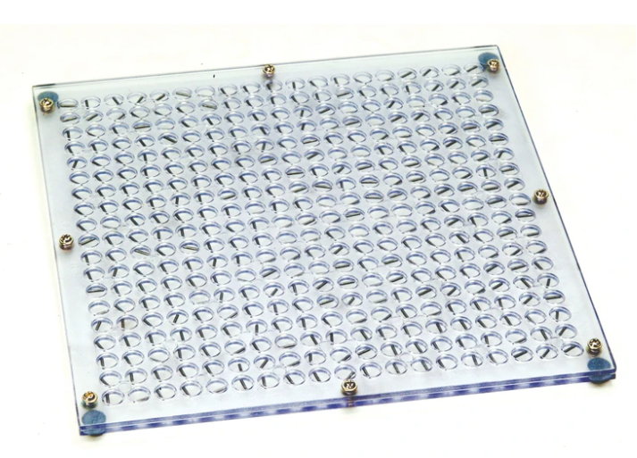 Genomskinlig demonstrationsplatta i plexiglas med små cirkulära kammare innehållandes järnflis i vätska som fungerar oberoende av varandra, likt en plottningskompass. Plattan är ett perfekt verktyg för studier av magnetiska fält.