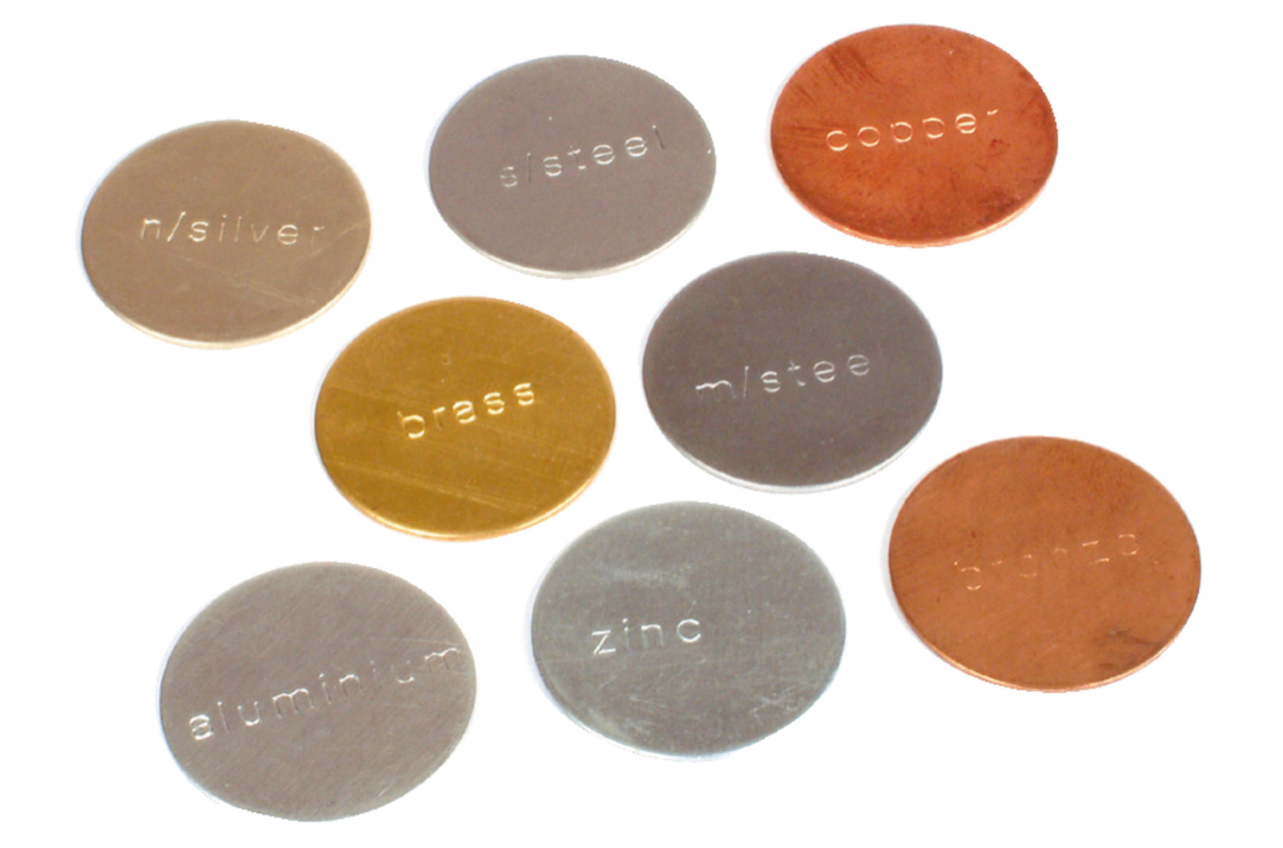 8 st metallplattor bestående av brons, mässing, stål, nickel, rostfritt stål, zink, koppar och aluminium.