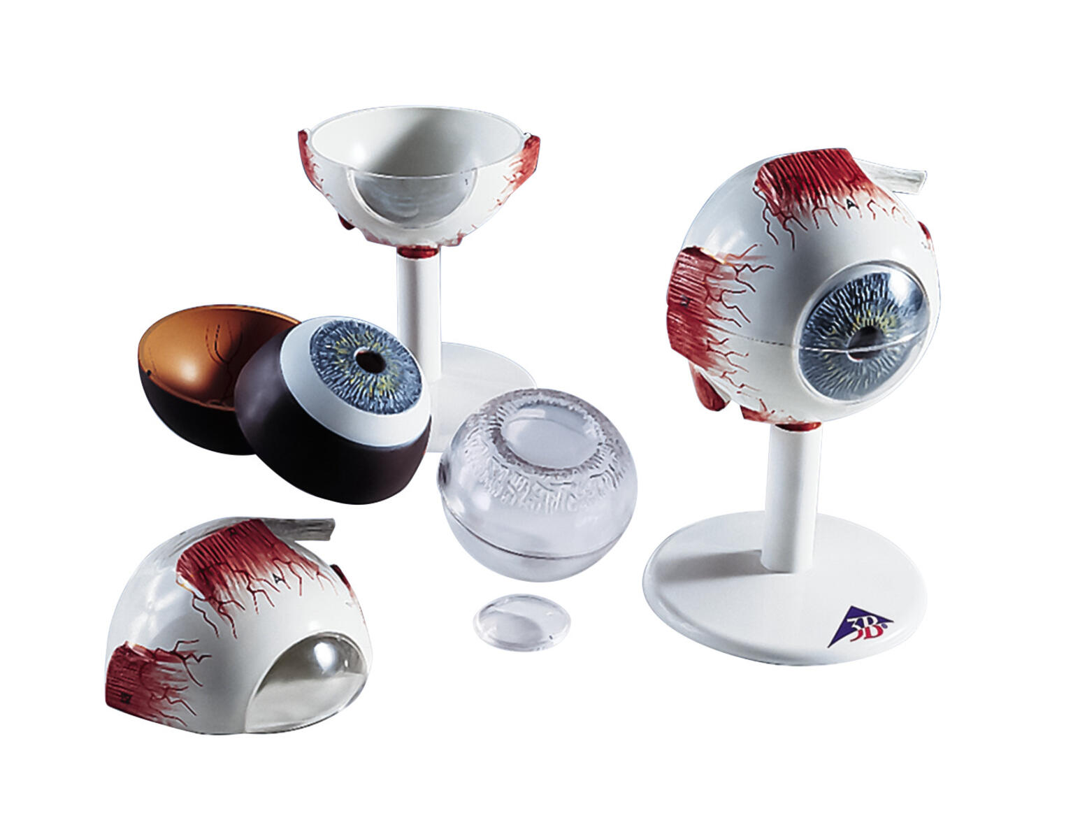 Hur ser ett öga ut och vilka olika delar består det av. En modell monterat på ett stativ som består av 6st delar.