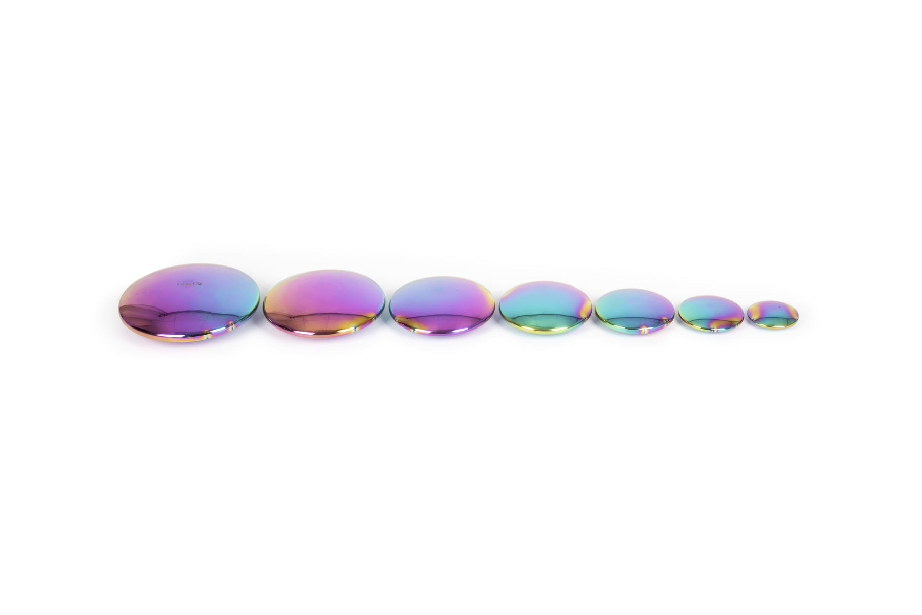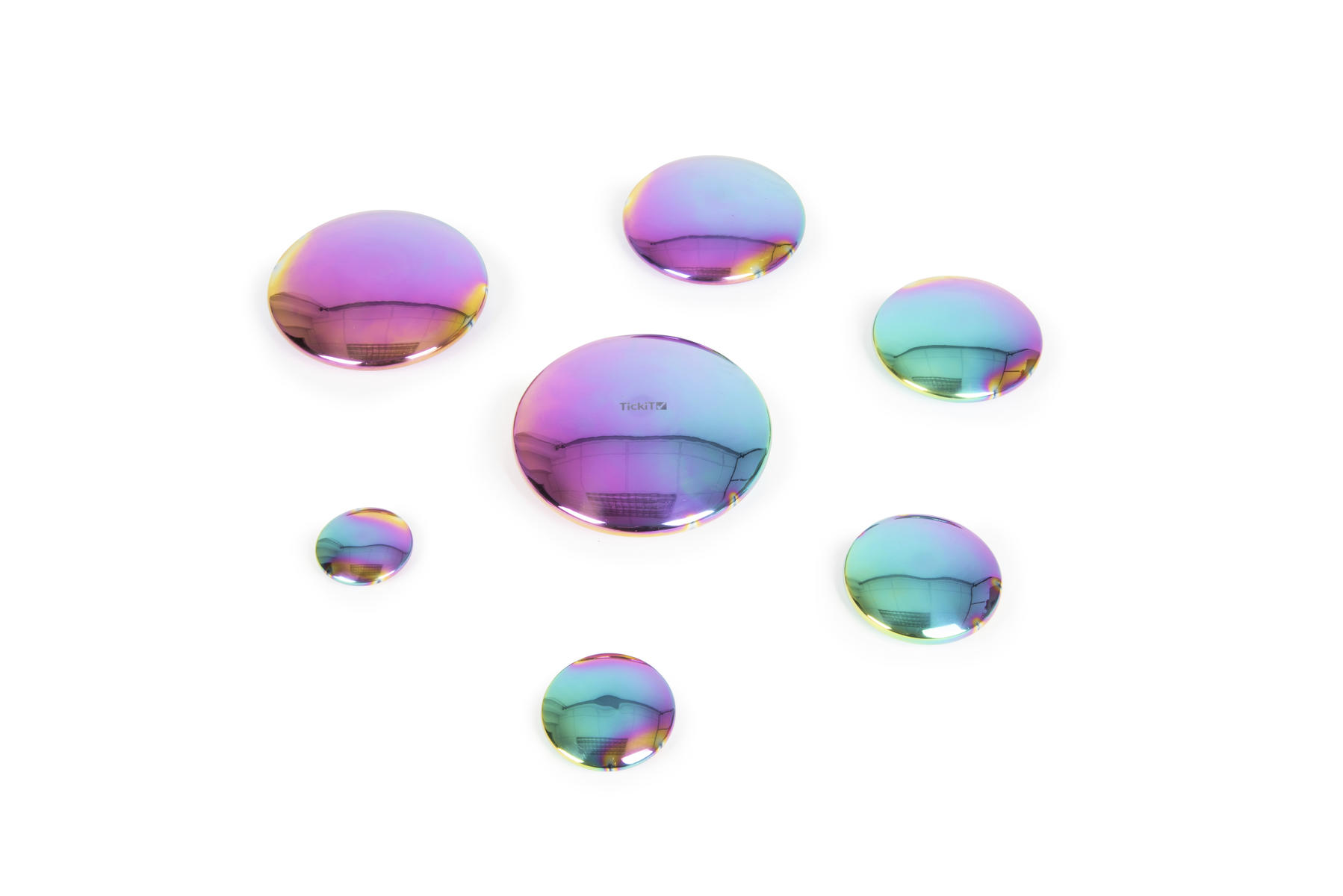 Sensoriska reflekterande och multifärgade knappar i robust rostfritt stål med en lyxig känsla. De är lätta, smidiga och taktila att hantera. Spegelytan ger en något krökt och förvrängd reflektion.