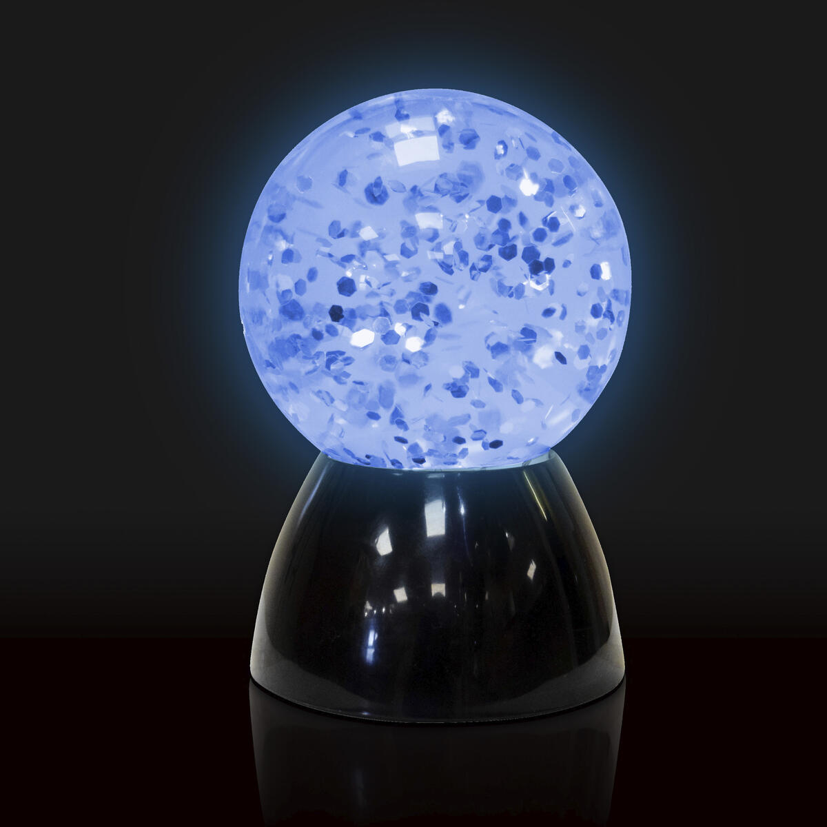 Glittret virvlar mjukt runt inuti kulan – likt en snöglob som fortsätter att leva utan att man behöver skaka den. Den arbetar helt tyst och skapar ett lugnande, fascinerande ljusspel som passar både i mysiga hörn och som sensoriskt stöd.