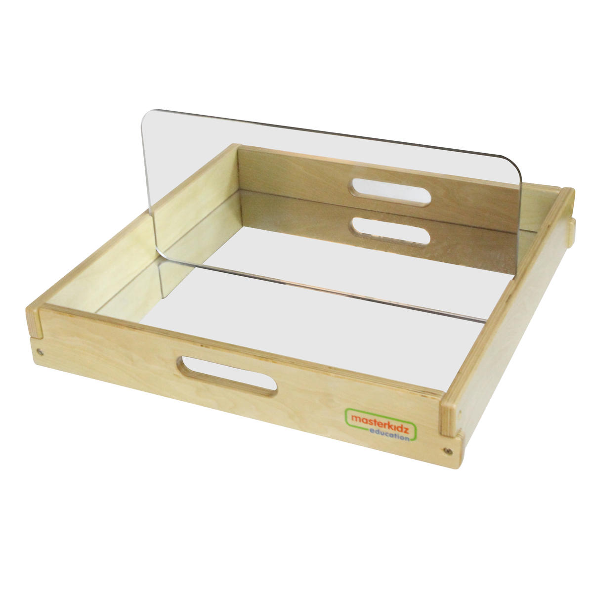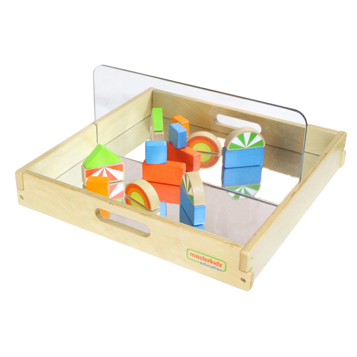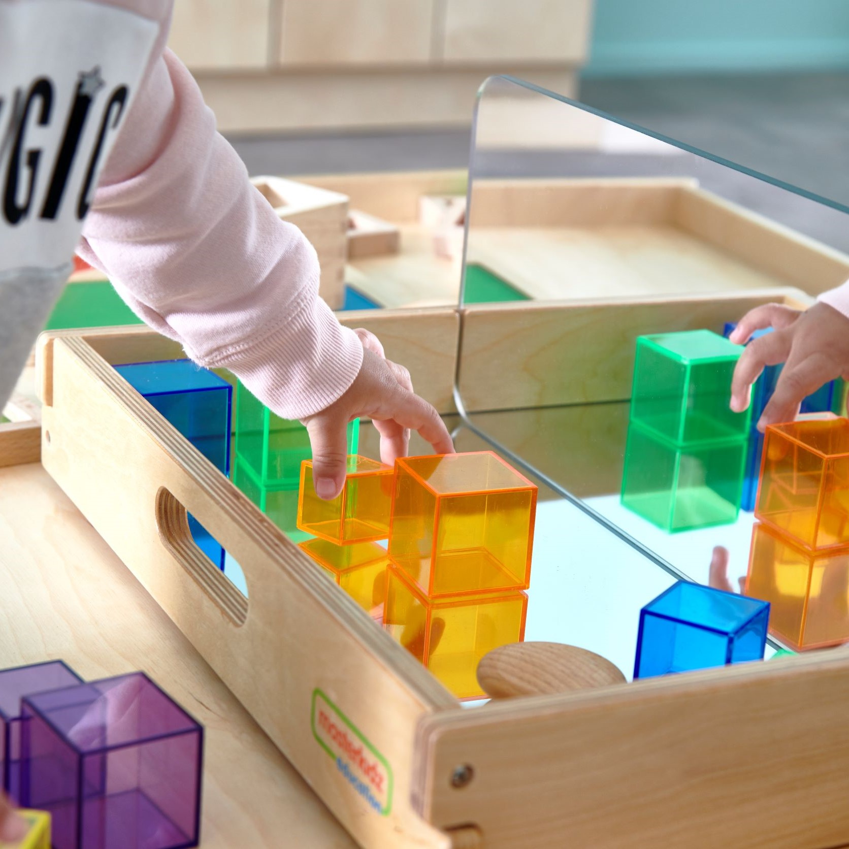 Ett hjälpmedel för att förstå reflektion, mönster och geometri. Barnen kan t.ex. bygga på varsin sida om spegeln och förklara för varandra hur de byggt, eller bygga upp små miljöer som reflekteras i speglarna. Mittdelen är avtagbar vilket ökar användningsmöjligheterna ytterligare.