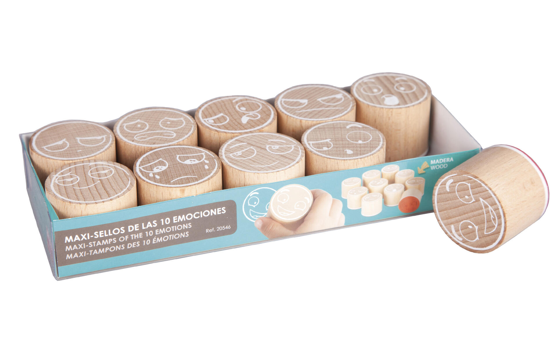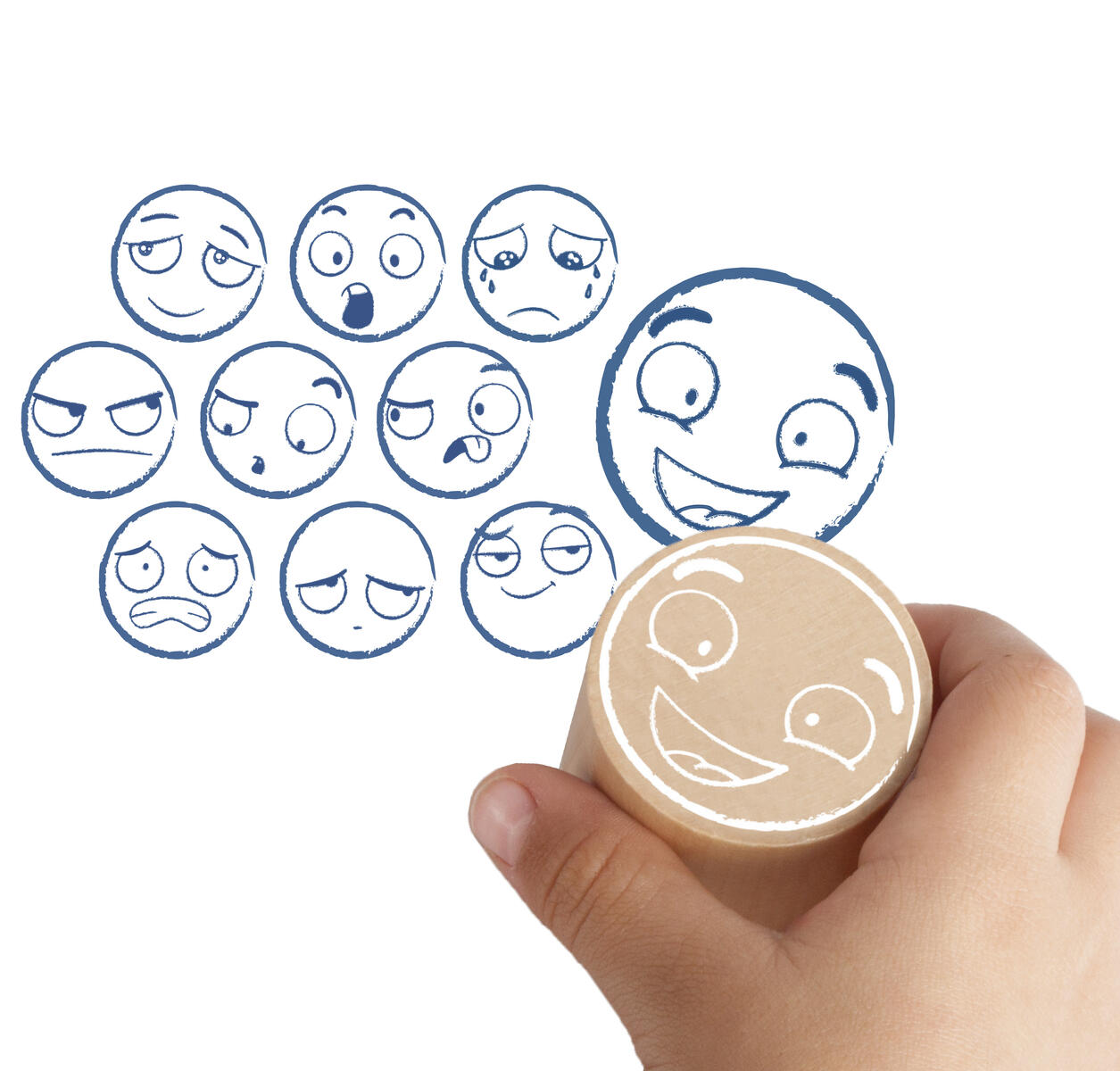 Ett set med 10 stora stämplar som visar våra 10 grundläggande känslouttryck: glädje, självförtroende, beundran, nyfikenhet, överraskning, ilska, avsky, ledsen, rädd och skyldig. Dessa hjälper barn att identifiera och uttrycka sina känslor och utvecklar deras sociala och emotionella färdigheter. Kan användas med vilken stämpeldyna som helst.
