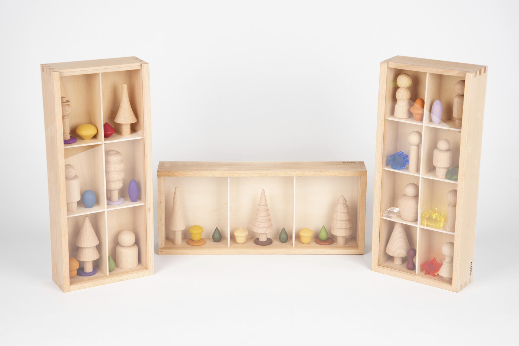 3 lådor i björk som uppmuntrar till sortering och kategorisering av olika material och skatter som hittas inomhus eller i naturen. Mått: 375x160x63 mm. Från 3 år.