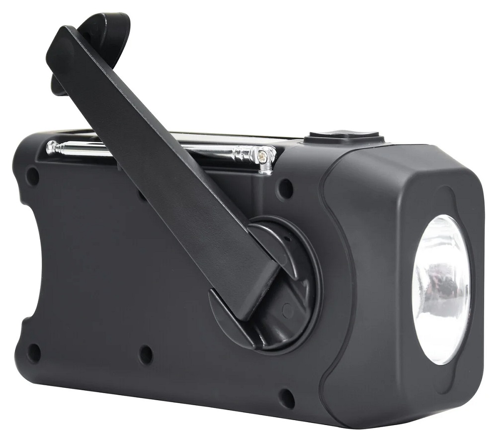 Vevradio med ficklampa som laddas när man roterar en vev, dynamon i radion omvandlar rörelseenergin till elektrisk energi och laddar batteriet.